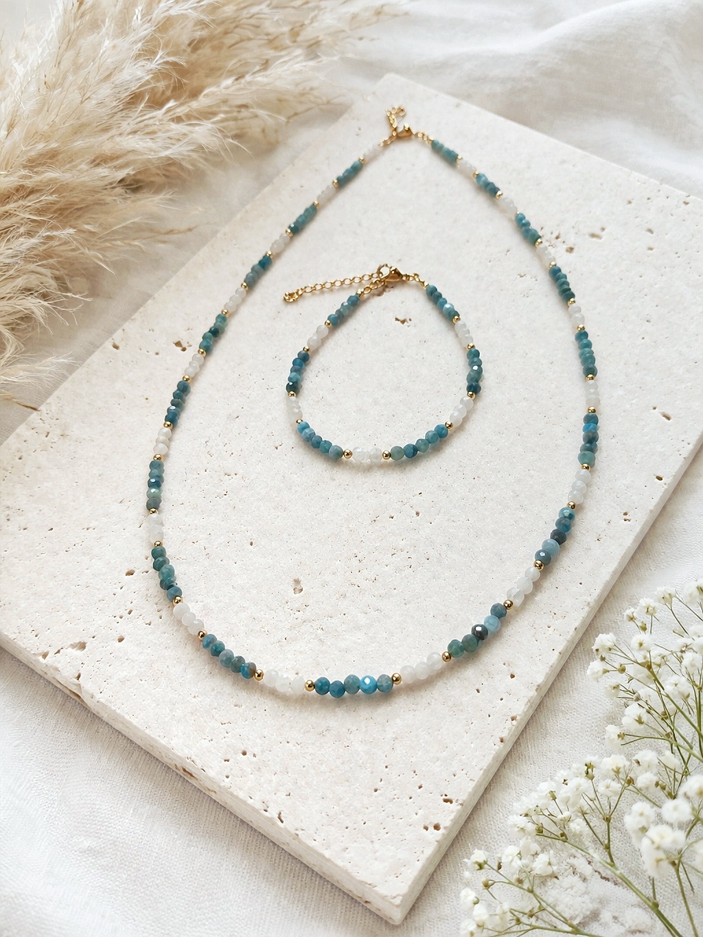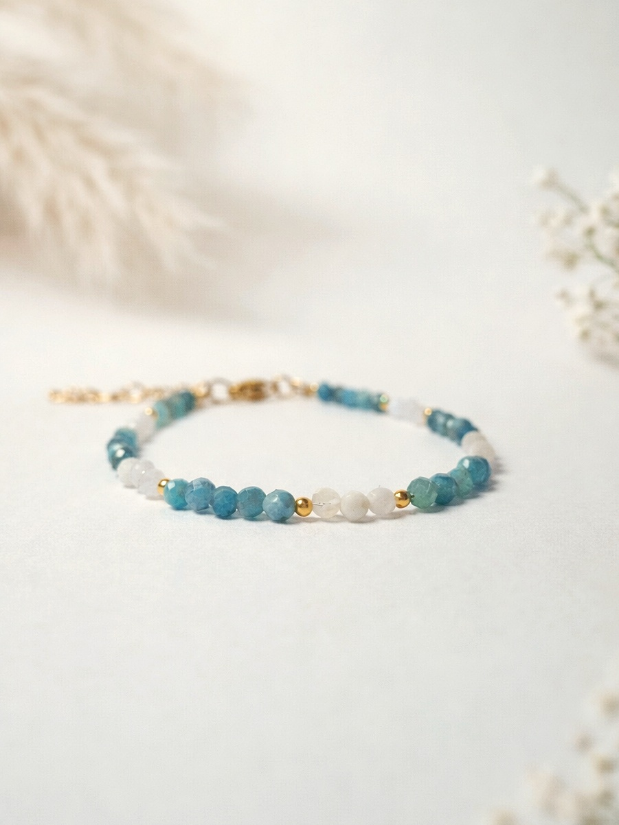 Bransoletka wykonana ręcznie z naturalnego apatytu i kamienia księżycowego, wykończona elementami ze stali szlachetnej w kolorze złotym. Drobne kamienie tworzą lekką, swobodną formę w odcieniach błękitu i bieli.