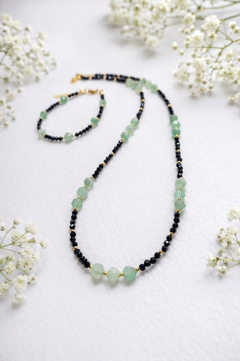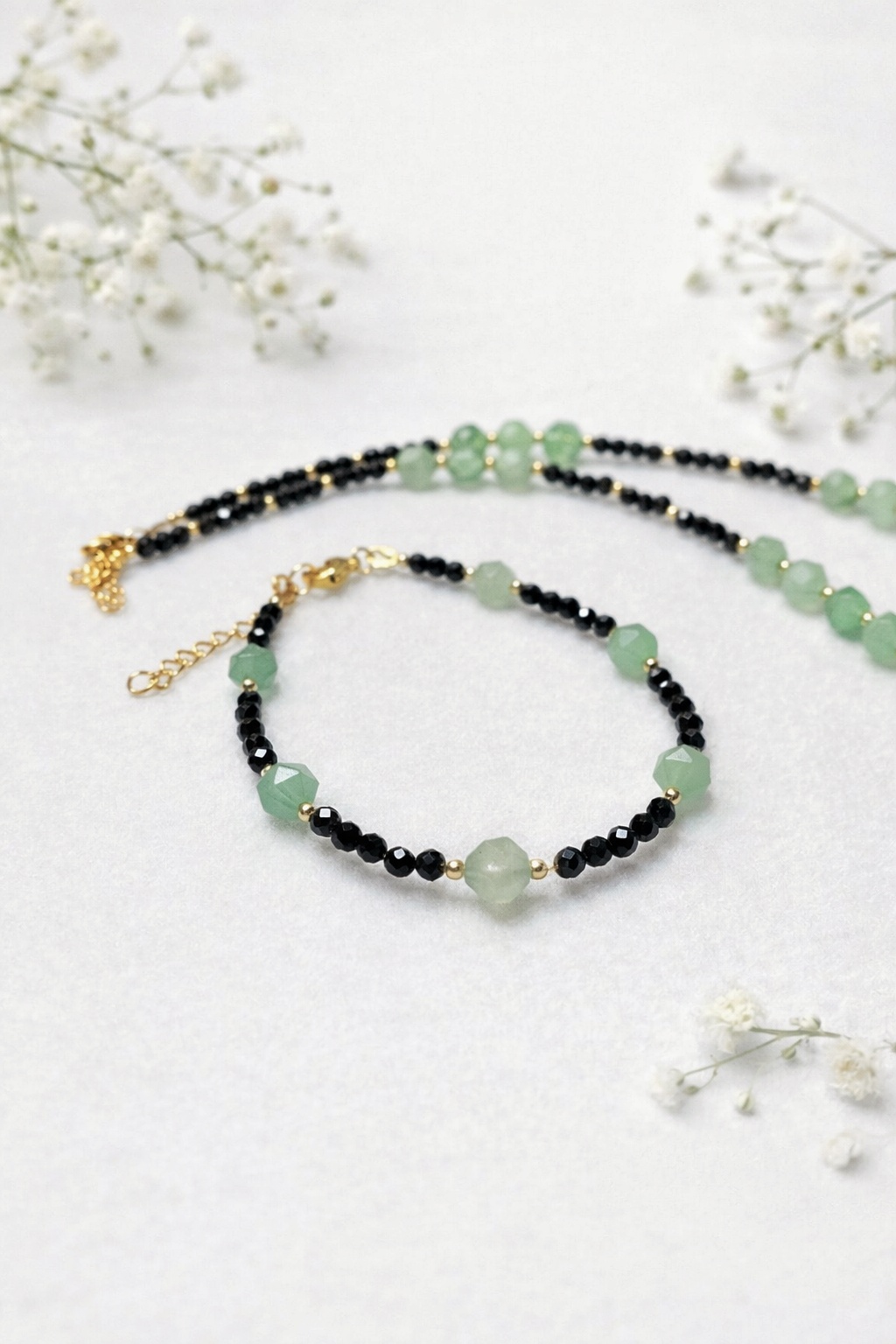 Bransoletka wykonana ręcznie z naturalnego czarnego turmalinu i awenturynu, wykończona elementami ze stali szlachetnej w kolorze złotym. Prosta forma z wyraźnym kontrastem ciemnych i zielonych kamieni.