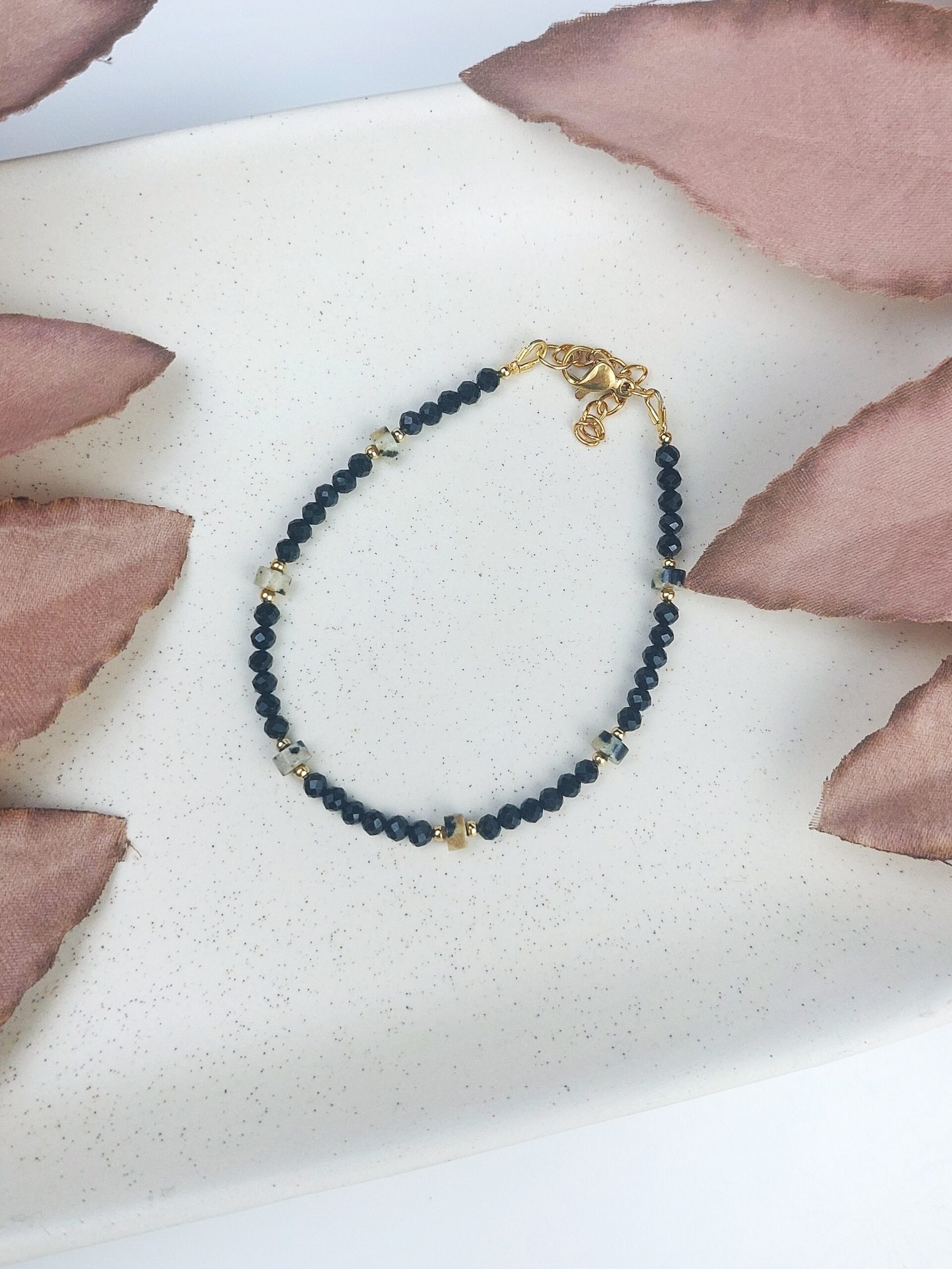 Elegancka, ręcznie wykonana bransoletka z naturalnych kamieni w stonowanej, czarnej tonacji. Idealna dla osób szukających ochrony energetycznej i subtelnego stylu.