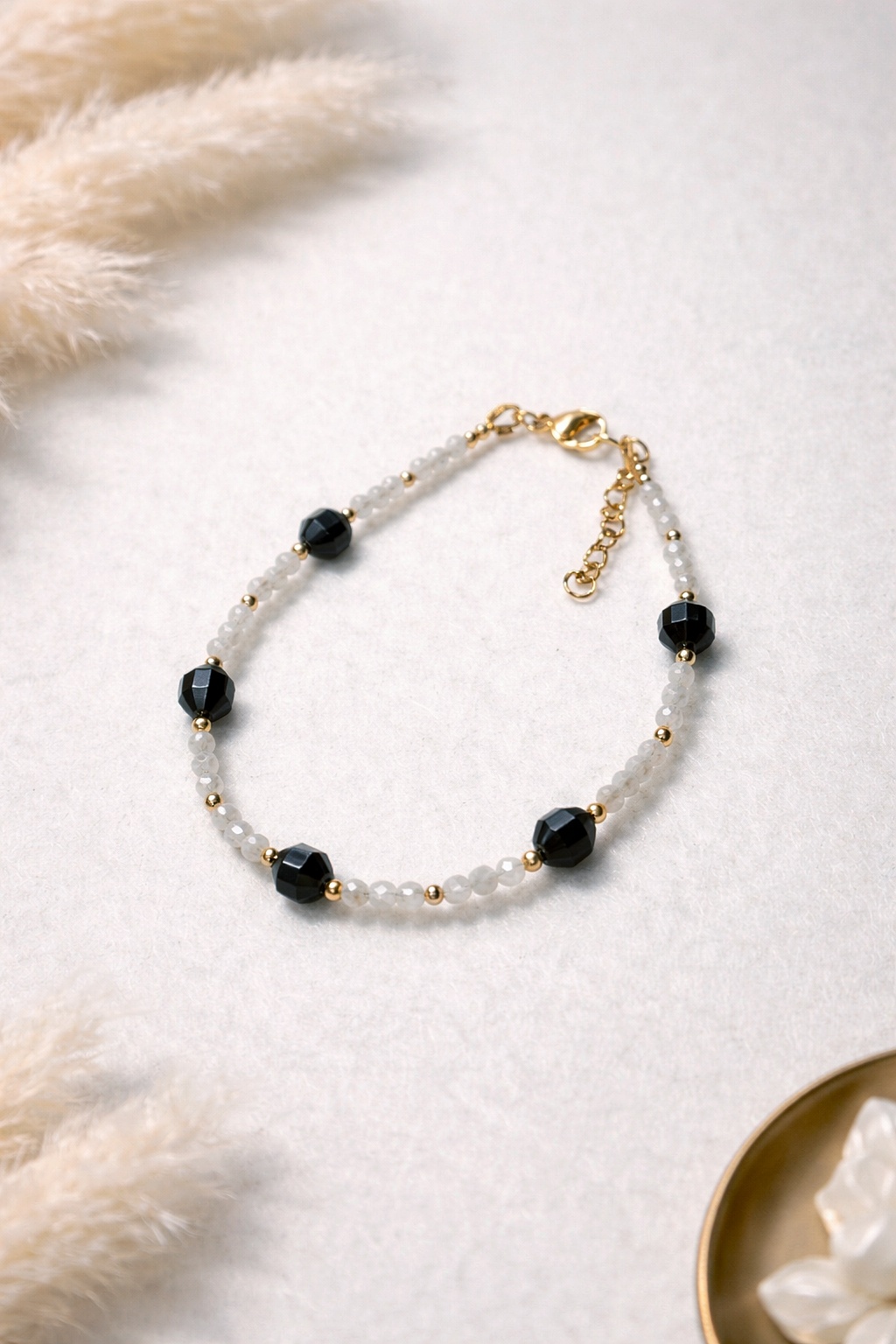Bransoletka wykonana ręcznie z naturalnego kamienia księżycowego i czarnego turmalinu, wykończona elementami ze stali szlachetnej w kolorze złotym. Prosta forma z wyraźnym kontrastem jasnych i ciemnych kamieni.