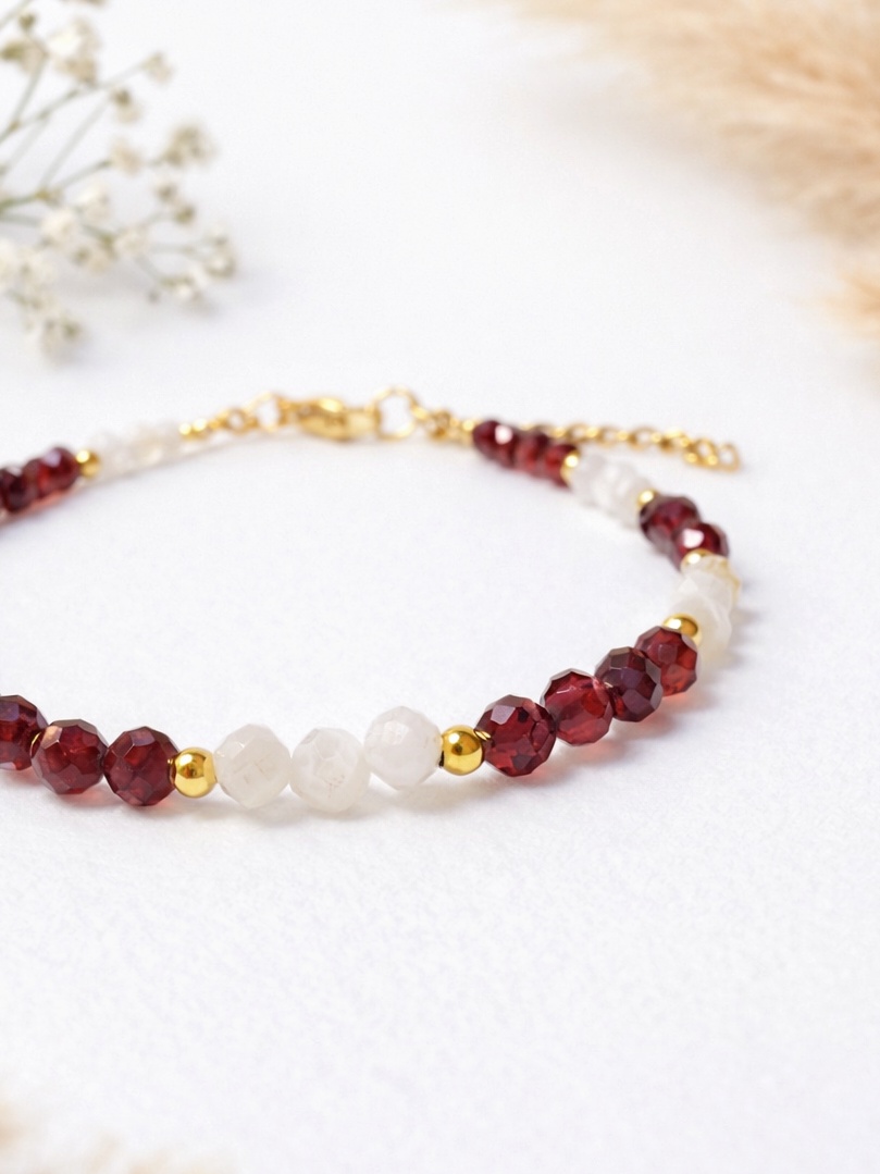 Bransoletka wykonana ręcznie z naturalnego kamienia księżycowego i granatu, wykończona elementami ze stali szlachetnej w kolorze złotym. Prosta forma z wyraźnym połączeniem jasnych i ciemnych kamieni.