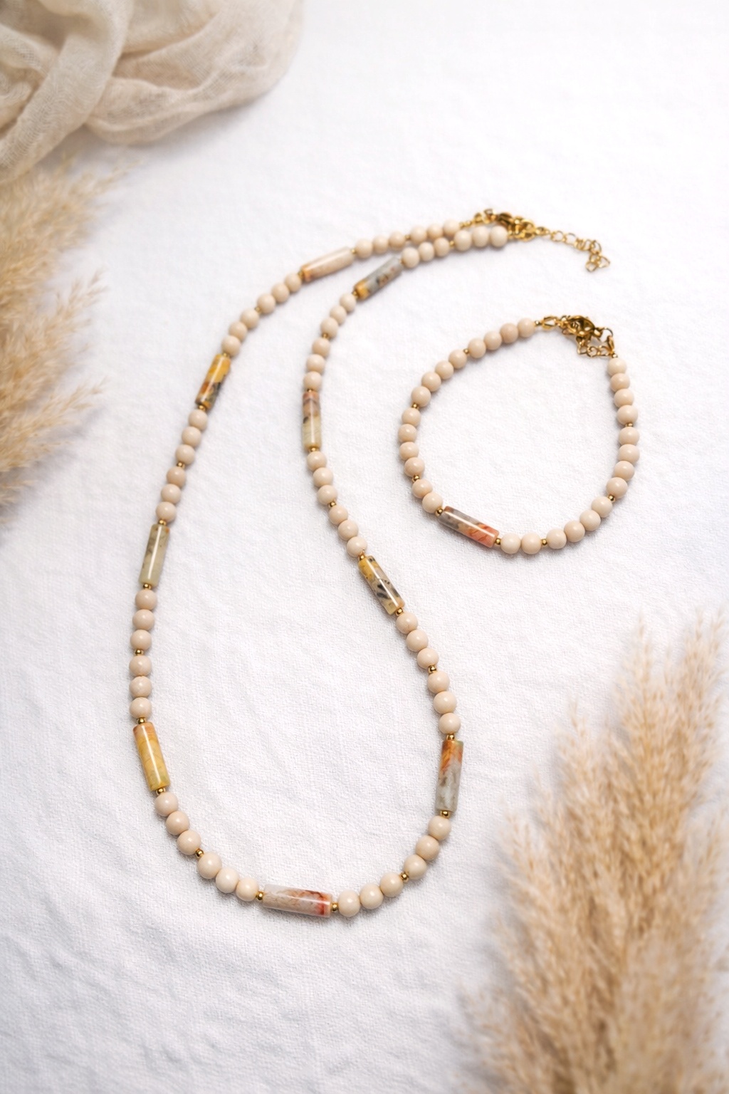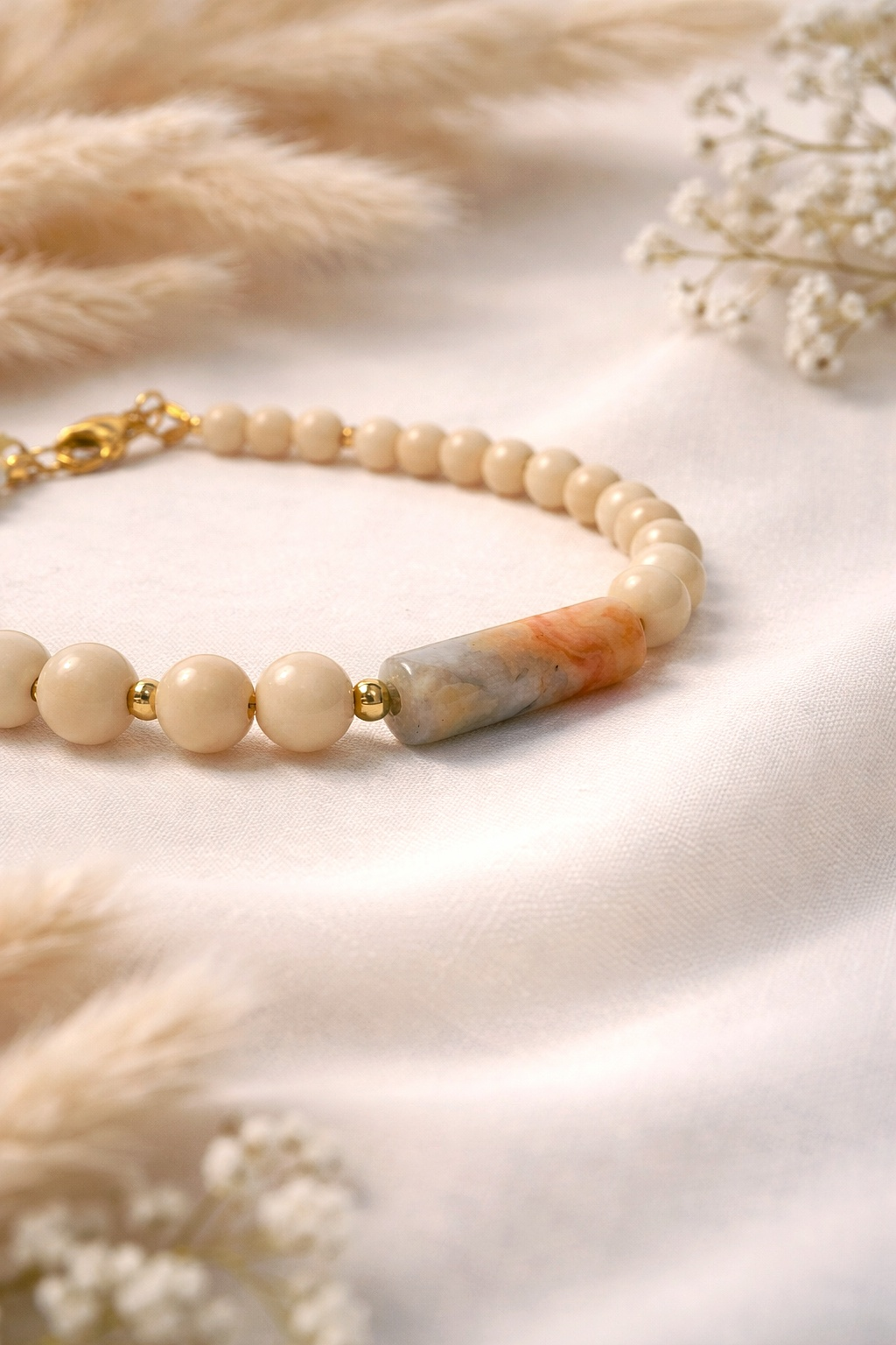 Bransoletka łącząca kamień rzeczny z jaspisem o ciepłym, ziemistym charakterze. Naturalne odcienie i subtelne przejścia kolorów tworzą spokojną, harmonijną całość inspirowaną naturą.