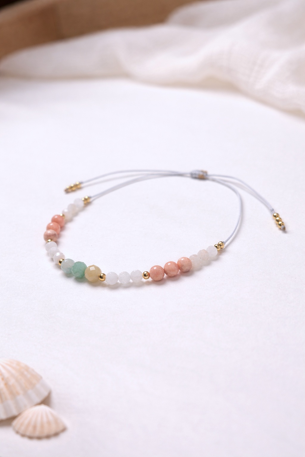 Zestawienie rodonitu, kamienia księżycowego i amazonitu tworzy delikatną, harmonijną kompozycję.