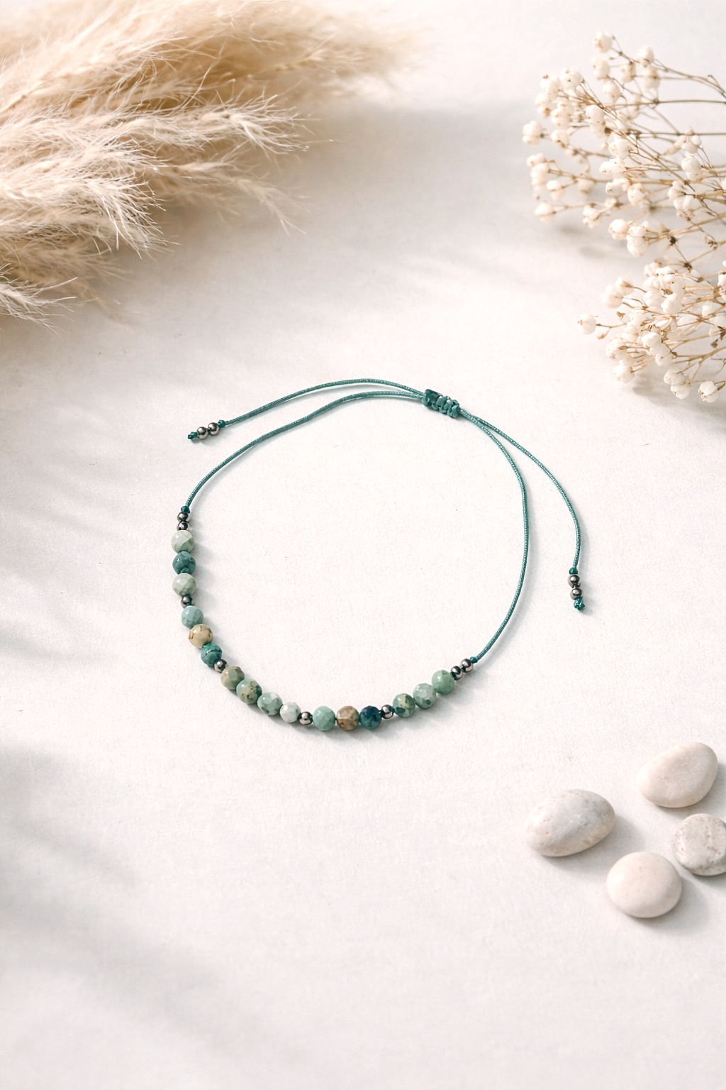 Całość osadzona na trwałej nici nylonowej z regulacją, dzięki której bransoletkę łatwo dopasować do nadgarstka. Srebrne elementy ze stali podkreślają tonację kamieni i nadają całości minimalistycznego wyrazu.