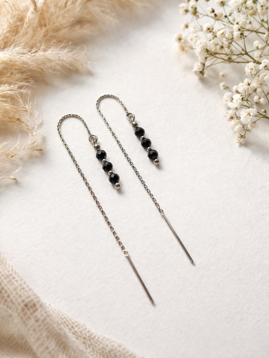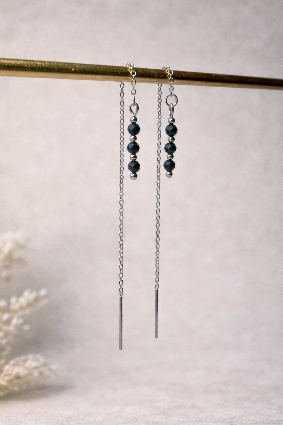 Kolczyki wykonane ręcznie z naturalnego czarnego turmalinu, na cienkim łańcuszku ze stali szlachetnej w kolorze srebrnym, przekładanym przez ucho. Kilka kamieni ułożonych w prostej, pionowej formie.
