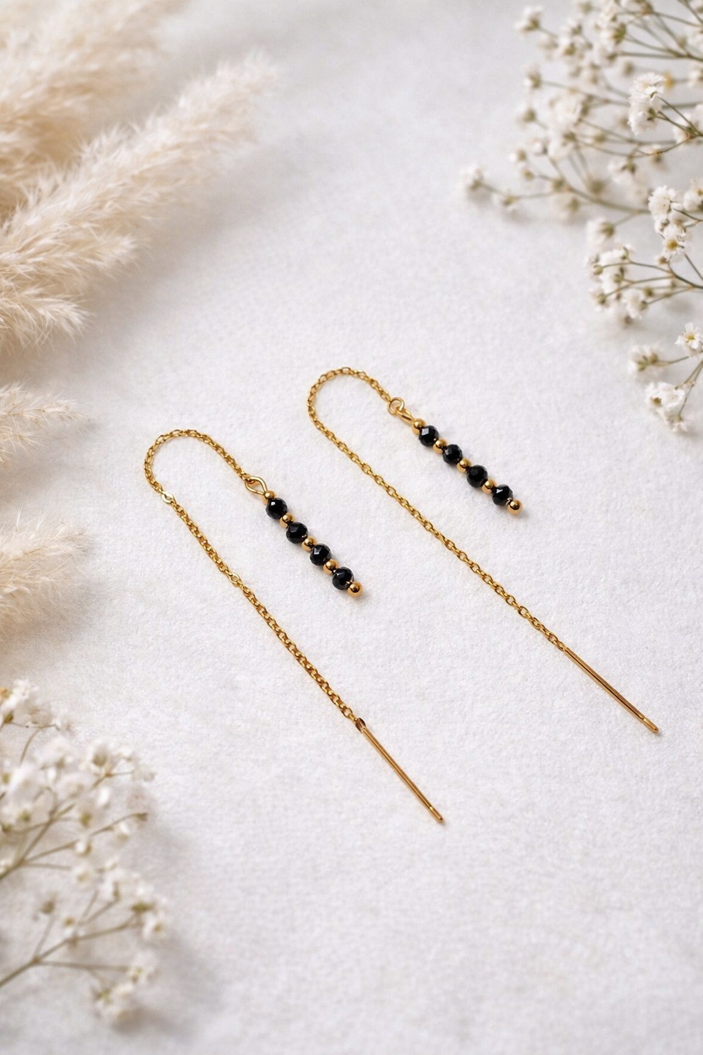 Kolczyki wykonane ręcznie z czarnego turmalinu, na cienkim łańcuszku ze stali szlachetnej w kolorze złotym, przekładanym przez ucho. Kilka kamieni ułożonych w prostej, pionowej formie.