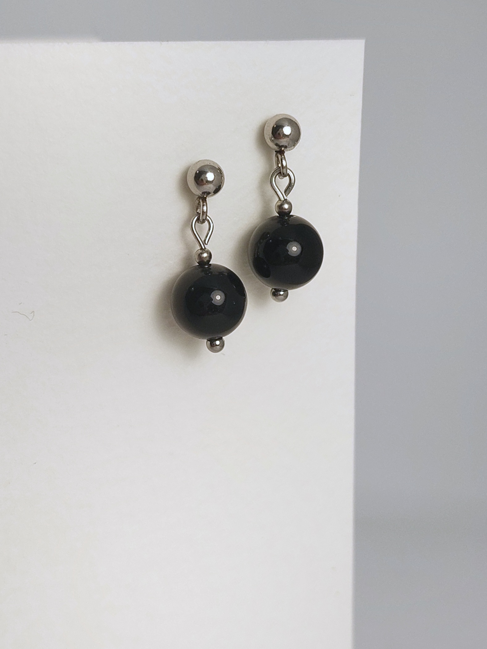 Kolczyki z czarnego onyksu na bazie ze stali szlachetnej. Zapięcie typu „baranek”.