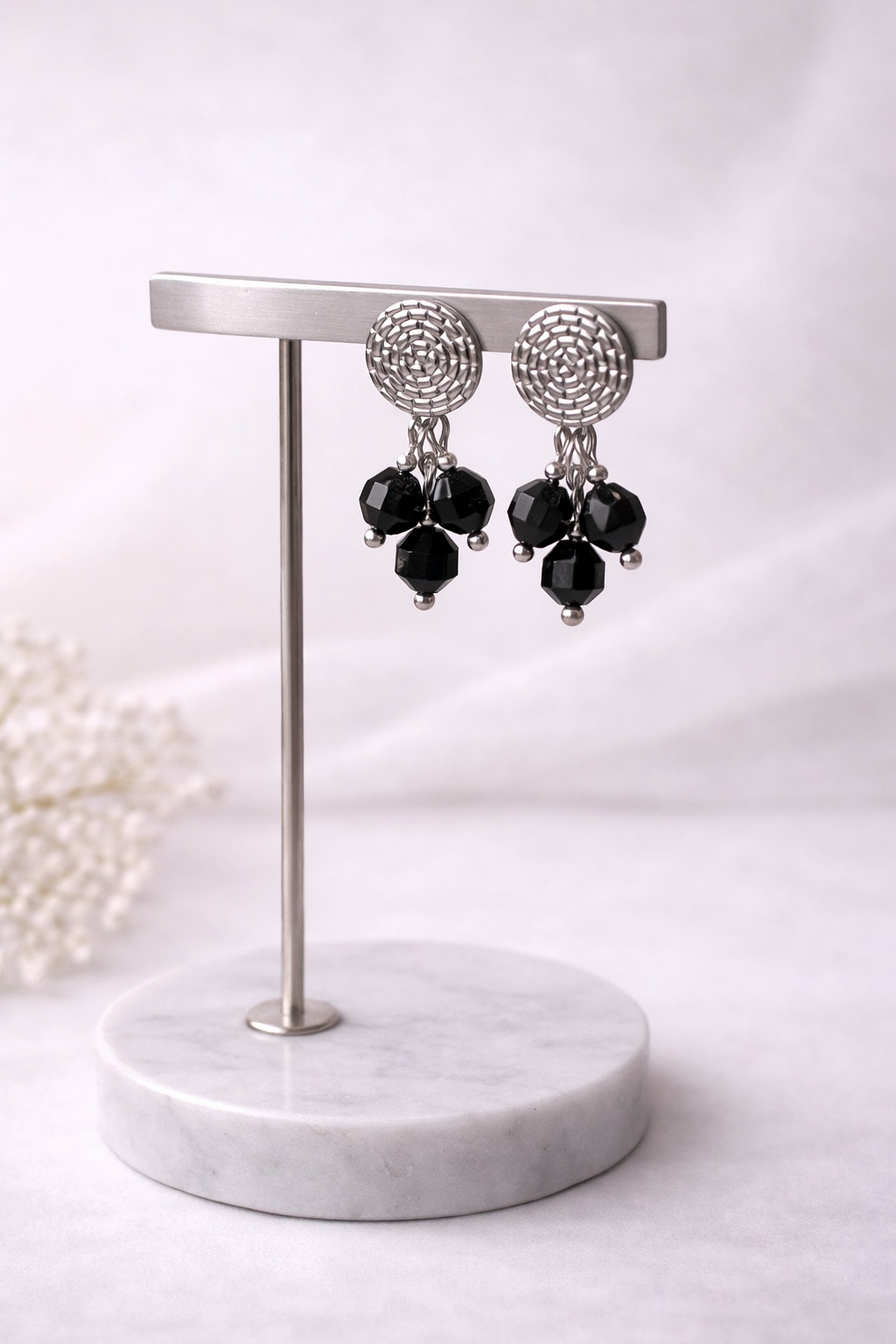 Kolczyki wykonane ręcznie z czarnego turmalinu, na bazie ze stali szlachetnej w kolorze srebrnym.