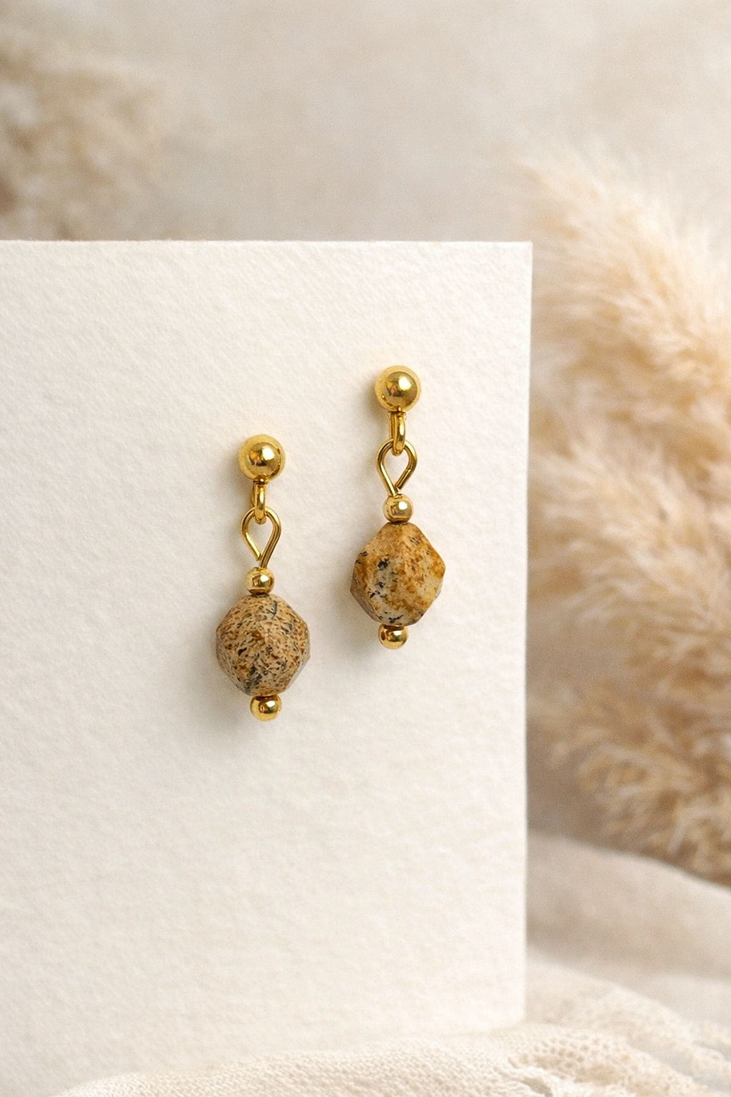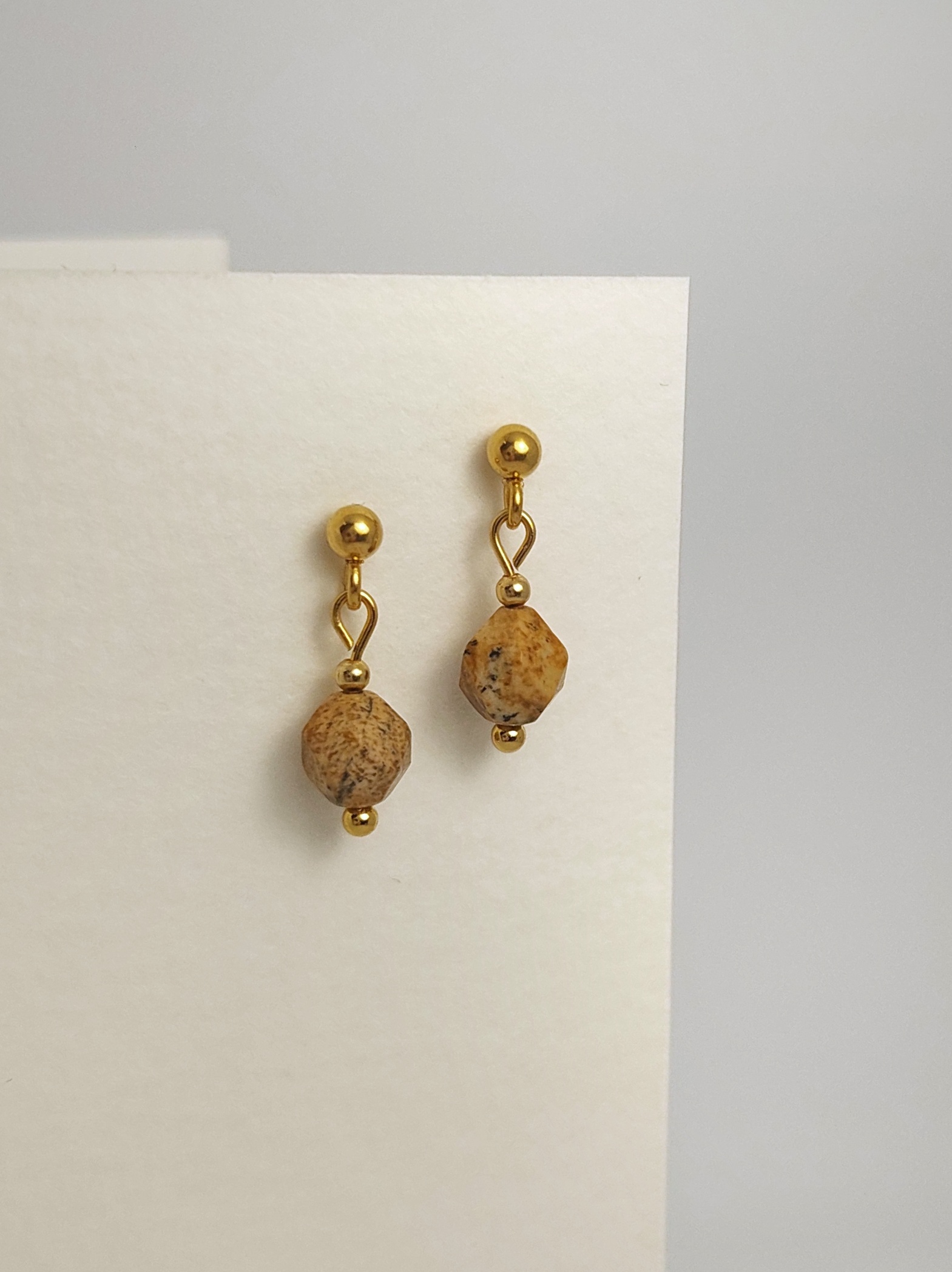 Kolczyki z jaspisu krajobrazowego, na bazie ze stali szlachetnej. Zapięcie typu „baranek”.