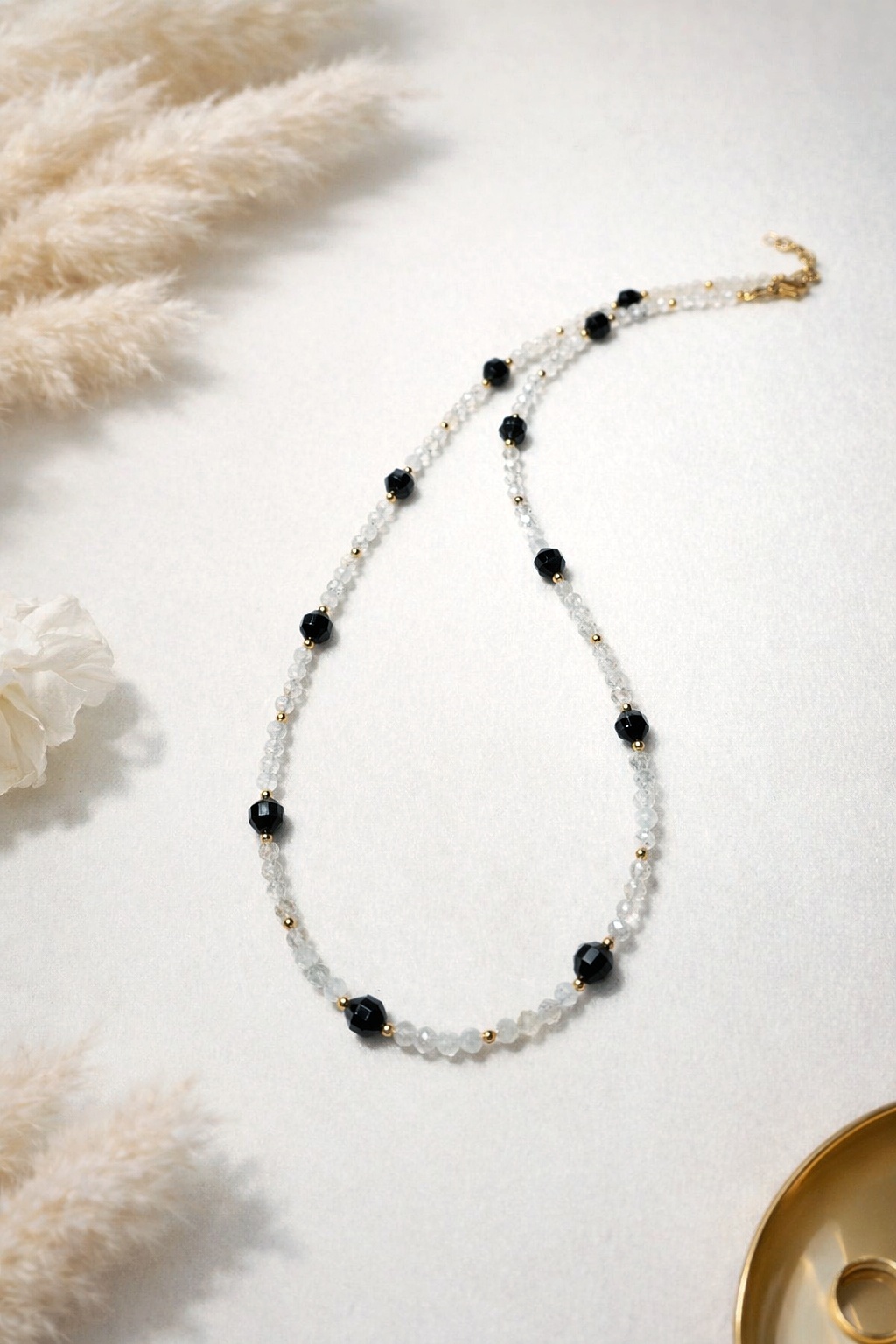 Ręcznie wykonany naszyjnik z kamienia księżycowego i czarnego turmalinu, wykończony elementami ze stali szlachetnej. Zestawienie jasnych kamieni z czarnymi akcentami nadaje mu wyraz, ale całość pozostaje spokojna i stonowana.