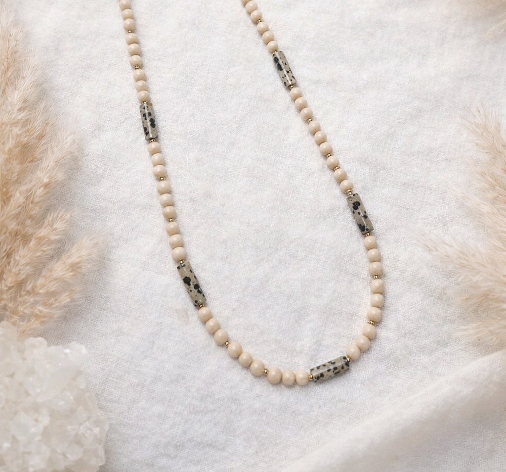 Naszyjnik łączący delikatny kamień rzeczny z charakterystycznym jaspisem dalmatyńskim o nieregularnym, nakrapianym wzorze. Kontrast jasnych, gładkich form z wyrazistym rysunkiem kamienia nadaje całości spokojny, ale nieoczywisty charakter.