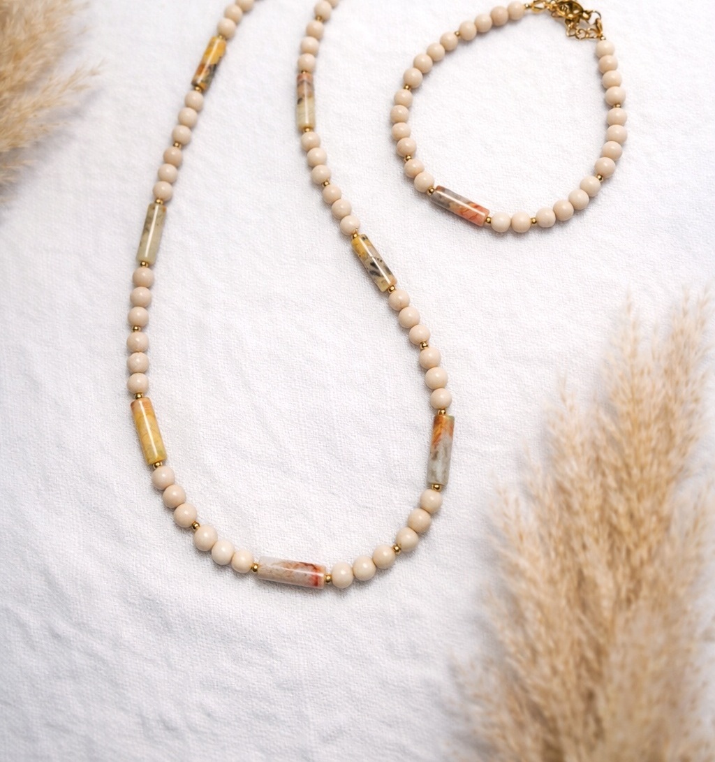 Naszyjnik łączący delikatny kamień rzeczny z jaspisem o ciepłym, ziemistym wybarwieniu. Nieregularne, subtelnie różniące się odcienie kamieni tworzą spokojną, naturalną kompozycję inspirowaną naturą.