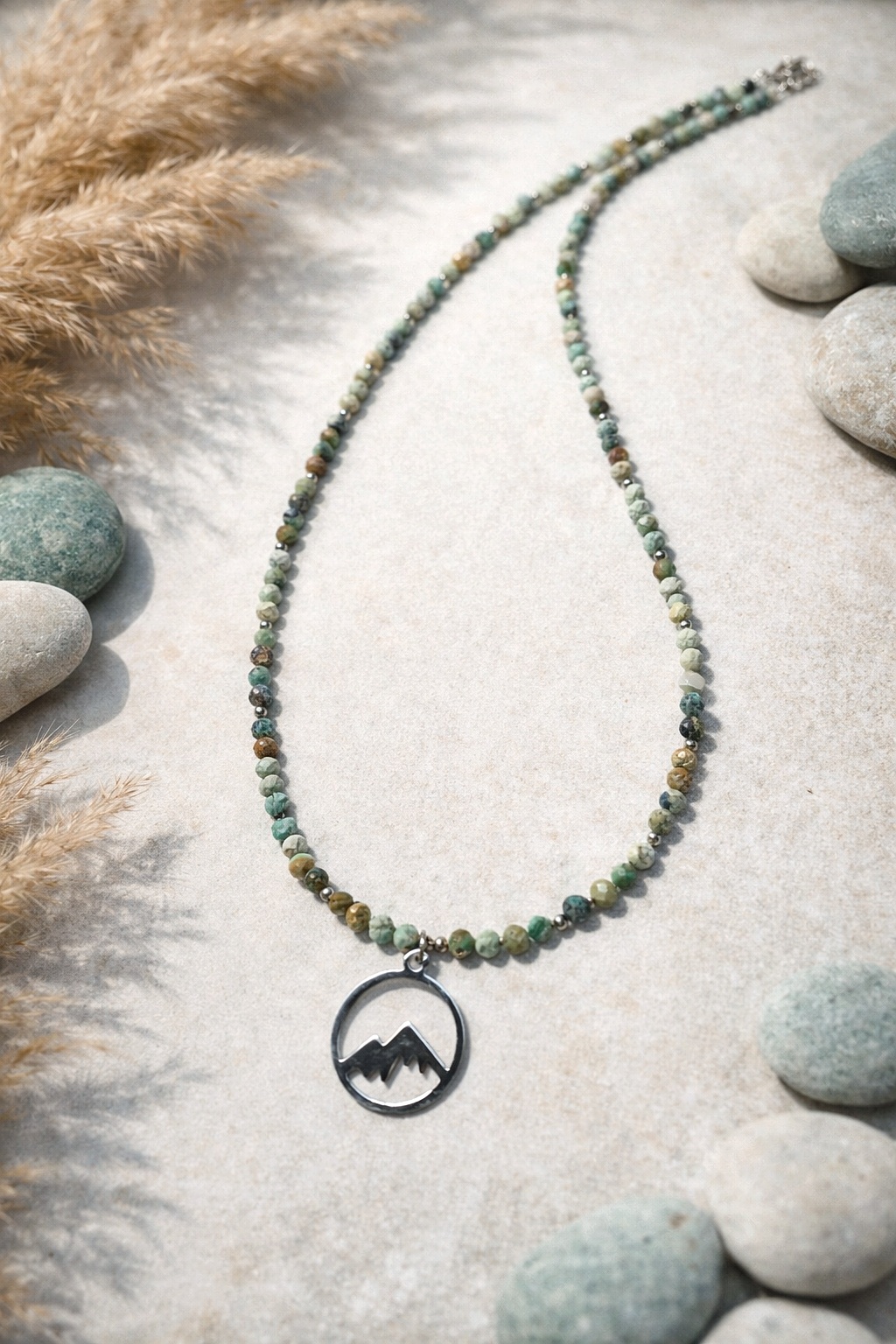 Naszyjnik z turkusu, którego naturalne odcienie zieleni przywodzą na myśl kamienie i pejzaże inspirowane naturą. Centralnym punktem jest zawieszka w górskim klimacie, w srebrnym kolorze – prosty, symboliczny motyw, który dodaje całości charakteru.
