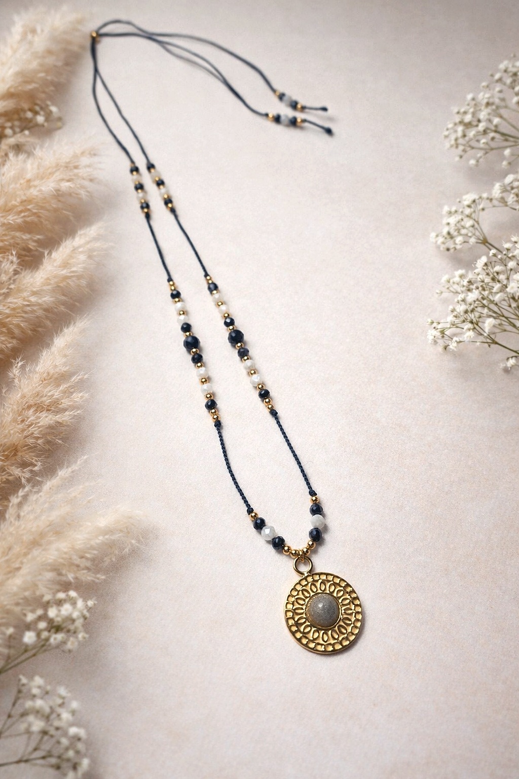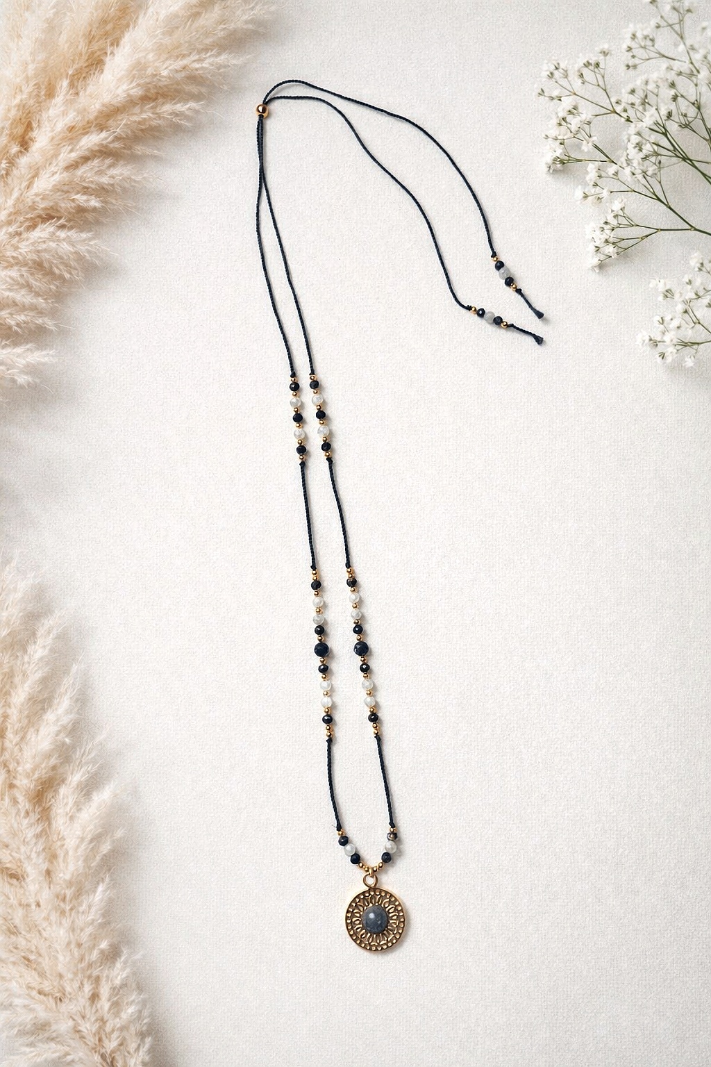 Naszyjnik na nici jedwabnej z regulowaną długością, którą można swobodnie dopasować do dekoltu. Wykonany ręcznie z kamienia księżycowego i turmalinu, z zawieszką z labradorytem i elementami ze stali szlachetnej w kolorze złotym. Lekka forma z delikatnym kontrastem jasnych i ciemnych kamieni.