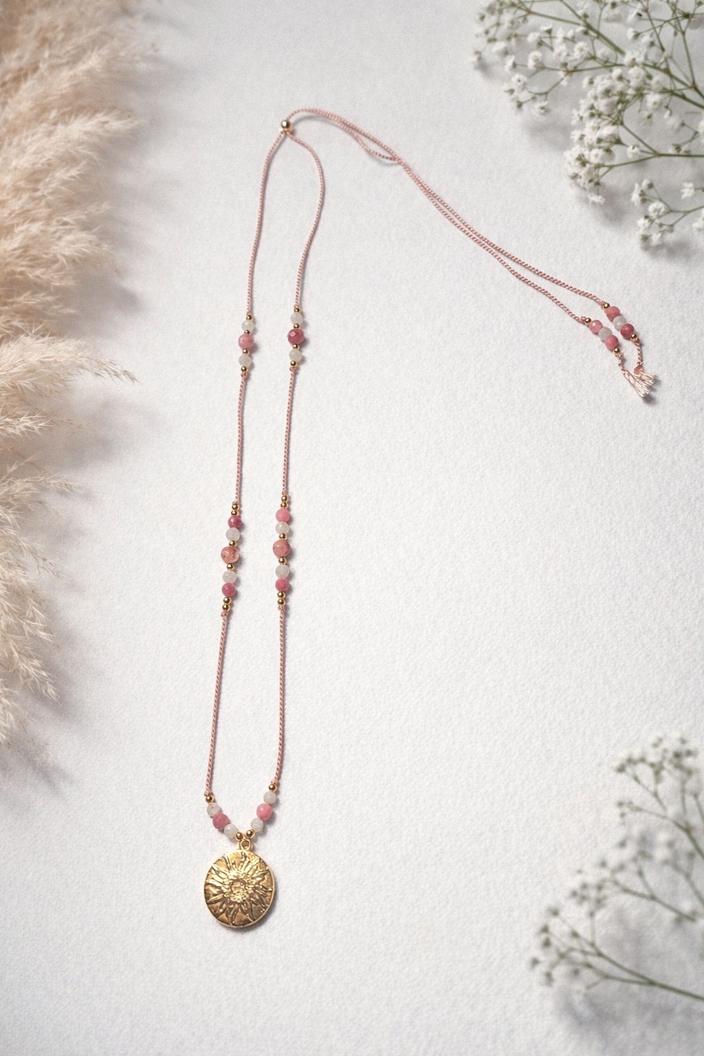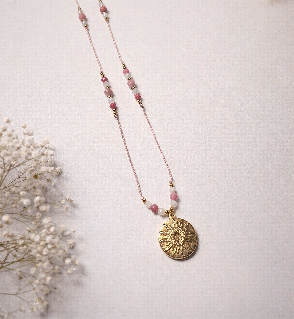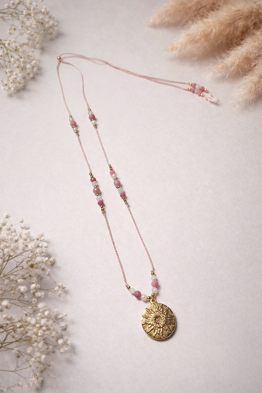 Delikatna kompozycja rodonitu i kamienia księżycowego została uzupełniona dwustronną zawieszką słońce/księżyc ze stali w złotym kolorze.
