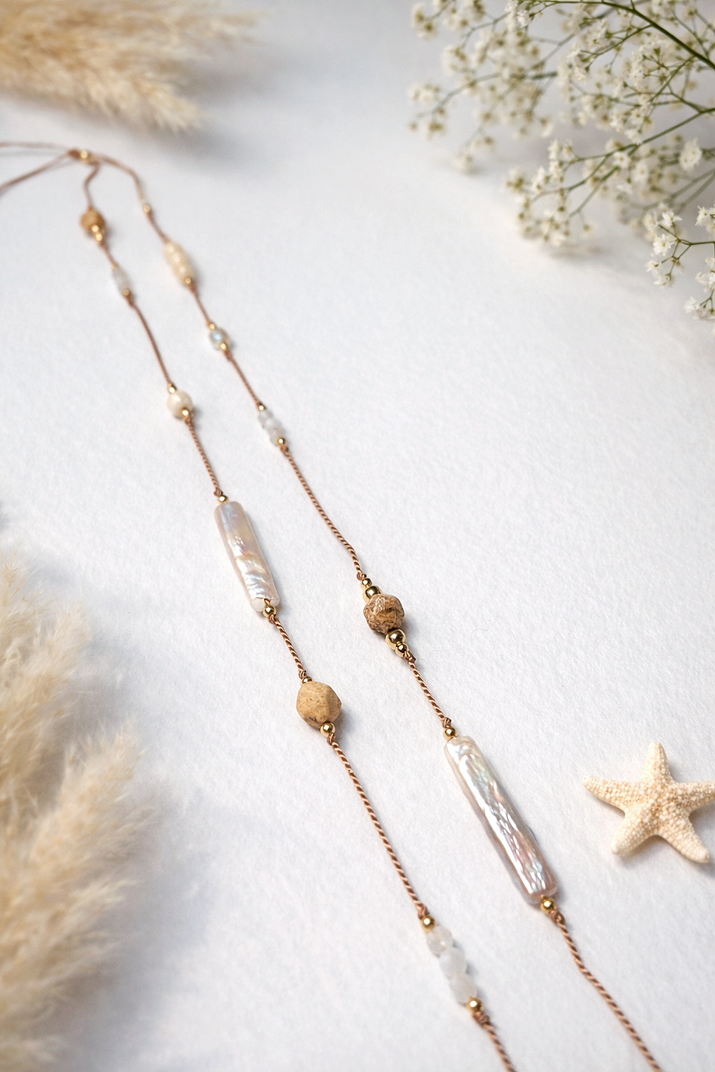 Naszyjnik wykonany jest na nici jedwabnej z regulowaną długością, co pozwala nosić go na różne sposoby – bliżej szyi lub swobodnie, jako dłuższy akcent.