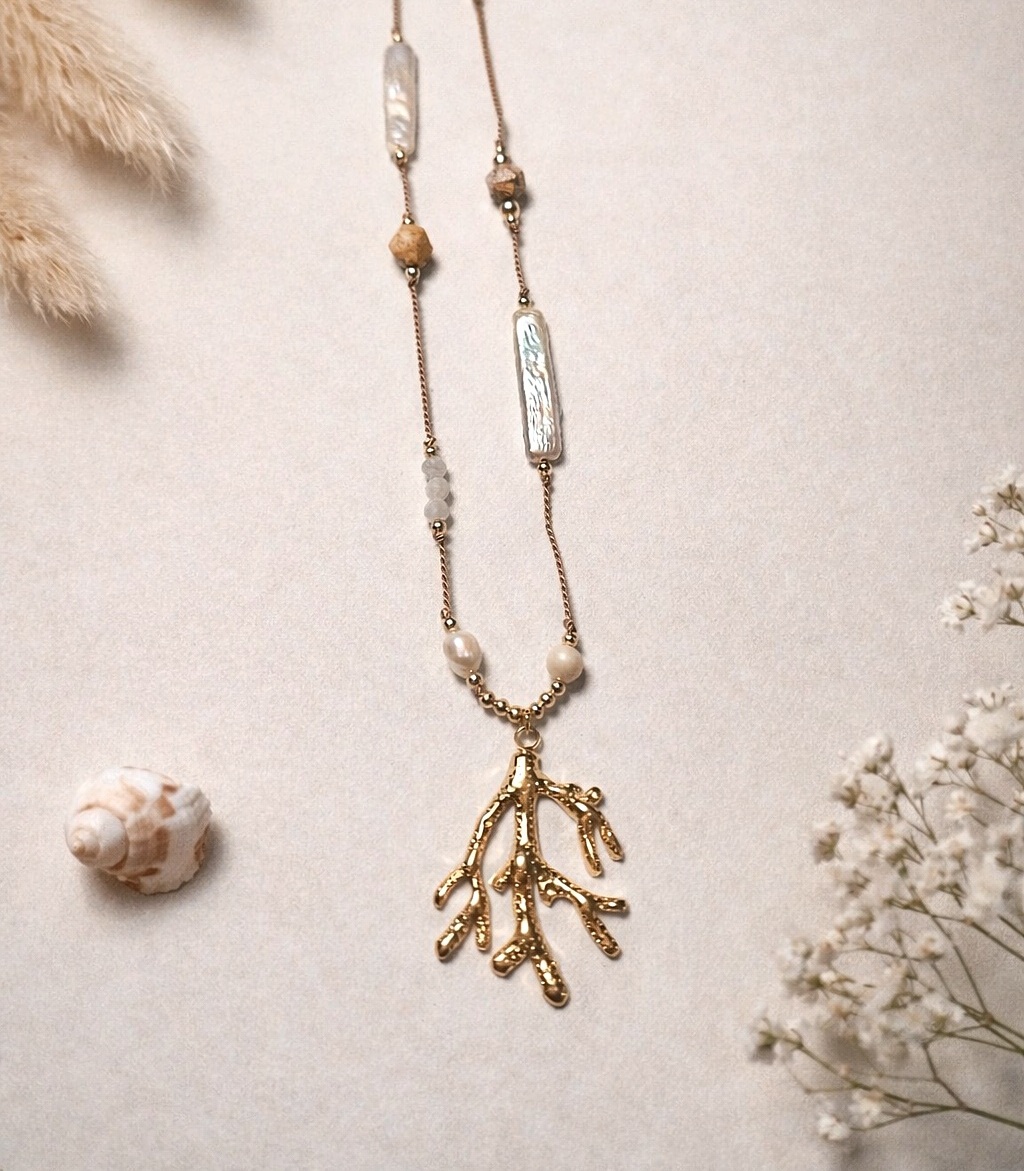 Zestawienie różnych kamieni tworzy spokojną, ziemistą kompozycję, która pięknie współgra ze złotymi akcentami stali. Całość dopełnia zawieszka w kształcie koralu, nadająca całości lekko organiczny, morsko-ziemny charakter.
